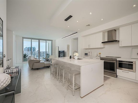 Experience an elevated expression of downtown Sarasota luxury at Residence 1013 in Mark Sarasota, where contemporary elegance meets resort-style sophistication. Positioned on the sought-after 10th floor, regarded as one of the building’s most distinguished residential levels, this residence offers a refined sense of exclusivity shared by its discerning residents. In the heart of Sarasota’s dynamic cultural and coastal district, this exceptional home embodies modern design, subtle comfort, and the vibrant convenience of downtown living. The split floor plan features two bedrooms plus a den and two-and-a-half baths, spanning 1,577 heated square feet and 1,711 total square feet, including a covered terrace, optimally square in design, providing defined depth and width. The expansive outdoor living space feels secluded yet connected, among lush treetops with park-like views of Smithsonian-registered Mermaid Fountain in nearby Paul Thorpe Park, formerly known as Pineapple Park, offering shaded seating. Enjoy distant southern city vistas, westerly views of the tropical pool deck and glowing Sarasota Bay sunsets. The open-concept layout highlights soaring ceilings, floor-to-ceiling glass, 10-foot ceilings, distinctive, architectural grand-format porcelain tile flooring with a textured finish and exquisite designer finishes. A gourmet kitchen showcases an upgraded induction cooktop for fast, energy efficient cooking, imported custom cabinetry, stone countertops, a bespoke backsplash and premium stainless steel appliances, flowing effortlessly into radiant living and dining areas ideal for entertaining or quiet reflection. The southern-facing living room enjoys tranquil natural light without the need for shades and each bedroom adorns top-tier Silhouette blinds. The south and southwest orientation provides privacy, protection from wind and rain, as well as a quiet and serene ambiance. The primary en suite serves as a peaceful sanctuary with a spa-inspired bath, electrified mirrors with custom lighting, a spacious walk-in closet and a door that opens to direct terrace access. Two deeded VIP parking spaces, fully covered, centrally located, protected from the elements and are located just steps from the elevator. A generous climate-controlled storage unit in a secure room, where packages are safely held, adds exceptional convenience only steps down the hall. The fifth-floor amenity deck crowns Mark Sarasota with resort-style indulgence: a heated saltwater infinity pool, spa, fire-pit lounge, grilling pavilion, bar, club room with catering kitchen, billiards, newsroom, and a premier fitness center with yoga and spin studios equipped for virtual workouts. Beyond your door, experience the best of downtown Sarasota, from fine dining at Hyde Park Steakhouse, State Street Eating House, for more casual fare, Boca or Besos for tapas, to evenings at Sugar, Sarasota’s glamorous piano and champagne bar. Explore nearby luxury car dealership, galleries, salons, smoothies at Toastique, Bodybar Pilates and Ride Cycling Studio. Cultural treasures such as the Sarasota Opera House, Florida Studio Theatre, and Sarasota Art Museum are walking distance, while boaters will enjoy Marina Jack. Lido Beach is over the Ringling Bridge. With 24-hour concierge service, secure access, on-site management and a pet-friendly atmosphere, effortless grandeur unites luxury, convenience and Sarasota’s signature coastal charm in one unforgettable downtown address.