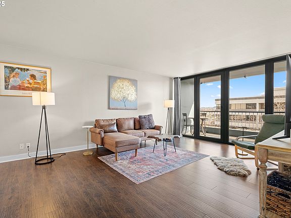Open Sunday 12-2pm! Light and bright one bedroom corner unit with a view! Welcome to downtown Portland's beautiful Harrison East Building. Steeped in Mid-Century architecture this building offers affordable living in a quiet corner of SW Portland. It's move-in ready with all furniture included. The "F" units are a popular layout with more than 700 square set on the corner of the building. Living is comfortable with a large open living space that flows outside to the deck. Looking North East you will take in territorial views including the Willamette river and bridges. Updates include beautiful LVT flooring through-out the home, stainless steel appliance, updated light fixtures, neutral paint colors, and granite counter-tops. This unit comes with a storage locker and large deeded parking space. The Harrison building complex boasts free shared laundry, secure entry, beautiful grounds, and a shared sauna and pool! Enjoy downtown living at its best. Walk to local parks, restaurants, cafes, the river, shopping, and local entertainment. Your commute will be a breeze with the street car just outside your door!
