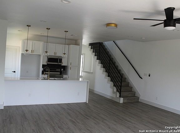 Modern white countertopsOpen floor planAbundant natural lightStainless steel appliancesCustom built closetsSpacious three bedroomsPendant lighting