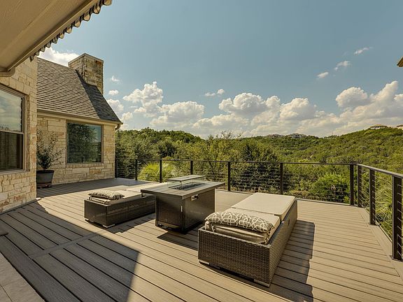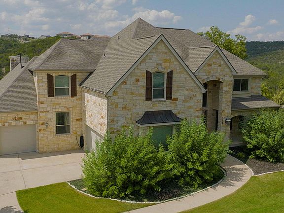 This home is beautifully situated on one of the largest lots in Gated The Ridge at Alta Vista with amazing Hill Country and Canyon views. 6,116 SF per Floor Plan Graphics. Total square footage includes 1,154 SF lower level private living quarters with 2 bedrooms, full bath, kitchen and living area plus 403 SF lower level office and sitting area. Property goes beyond back fence line and left side fence line. Extensive remodel. This home exemplifies comfort and functionality. As you enter, you're greeted by high ceilings, spiral staircase and abundant natural light in spacious living and dining area. Wood-look tile throughout living areas. New roof Nov 2024. New carpet throughout house. All windows replaced with Custom low E glass. See improvement list in documents. Chef-inspired Kitchen has been completely remodeled in 2020 with Thermador propane cooktop, double ovens, granite countertops, warming drawer and stainless farmhouse sink. Large center island with breakfast bar. Breakfast room with expansive views of the private backyard. Family room with floor to ceiling stone wood-burning fireplace ideal for family gatherings. Spacious primary suite with fireplace for peaceful solitude. Primary Bath completely remodeled in 2023 and is a true spa-like retreat with jetted tub, amazing shower with veined tile walls and electric fireplace. Family fun awaits in upstairs media room great for watching movies or your favorite sports teams. 2 bedrooms, full bath and additional En-suite bedroom upstairs. Retreat outdoors to the backyard oasis with beautiful pool, spa and waterfall with Hill Country and Canyon views. Automatic awning covers expansive deck. Grill area for outdoor fun by the pool. Community amenities include clubhouse, pool, tennis courts, pickleball courts and fitness center. Walk to Lake Travis High School. Close to Hill Country Galleria. Come experience the Lakeway lifestyle. Lake Travis ISD