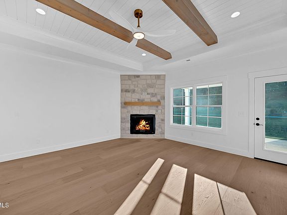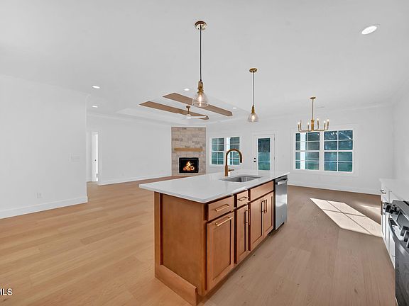 The living area features a cozy gas log fireplace with a shiplap tray ceiling & wood beams, flowing seamlessly into the dining space and stunning kitchen—complete with stainless steel appliances, gas range, large island, an abundance of cabinetspace, and a large pantry.