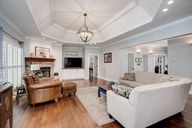 Corner stone fireplaceWaterfront homeRocking chair front porchRecreation roomHardwood flooringOffice with built-in bookcasesLarge walk-in pantry