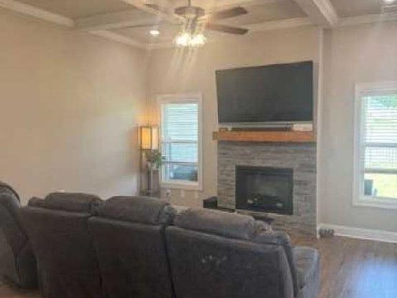 Electric fireplaceSplit floor planDouble sinkCovered porchPrivacy fenceCoffered ceilingsCarpet in the bedrooms