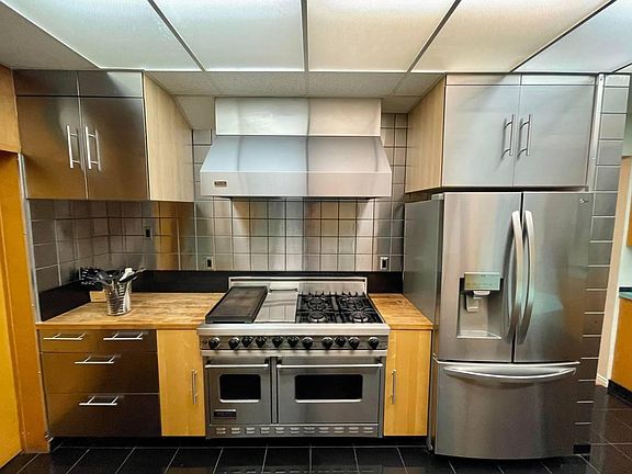 Entry level: Foyer, Great Room with fireplace; large west facing deck, guest bathroom, coat closet , eat-in kitchen (the kitchen is a chef's delight with all Viking professional stainless steel appliances- a double oven with a high BTU, 6 burner gas stove with all the bells and whistles (a griddle, a hood with lights, fan and warming lamps), a silent dishwasher and a side by side freezer-refrigerator.