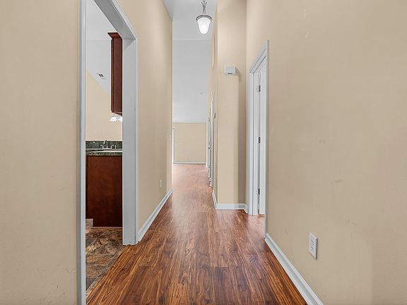 Back patioSingle-car garageCathedral ceilingsInviting open layoutGleaming laminate flooring