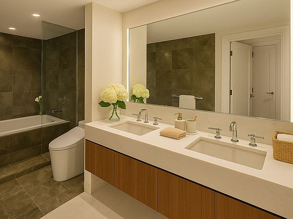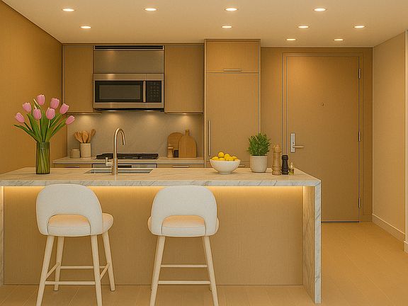 Thoughtfully designed by acclaimed architect Thomas Juul-Hansen, the residence features an expansive open-concept living and dining space, highlighted by floor-to-ceiling windows offering sweeping views of the Manhattan skyline. A handsome European oak entry door sets the tone for the refined palette and elevated finishes throughout. The chef's kitchen is a standout, outfitted with super-white quartzite countertops and island, a custom bronze and mirrored glass backsplash, and white oak cabinetry with a matte lacquer finish and fluted glass accents. Top-of-the-line Miele appliances include a refrigerator, freezer, induction cooktop with fully vented hood, wall and speed ovens, dishwasher, and a wine refrigerator. A Kraus undermounted sink paired with a custom chrome faucet completes this highly functional yet beautifully designed space. The living area is both warm and sophisticated, anchored by 7" wide European oak flooring and expansive skyline viewsideal for entertaining or quiet evenings at home. The primary bedroom suite is a peaceful retreat, featuring a spa-like en-suite bathroom adorned with Greek Bianco Dolomiti stone, Turkish Fiore di Bosco flooring, and Waterworks polished nickel fixtures. The secondary bath is equally well-appointed, with Turkish Cristalo Pearl stone walls, a Giselle Gray stone vanity and flooring, and additional Waterworks finishes. Additional conveniences include an in-unit Miele washer and ventless dryer, and a four-pipe fan coil HVAC system with zoned climate control for year-round comfort.