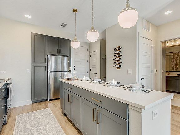 - Exterior features: Bicycle storage, Business Center, Carpeted bedrooms, Closet pantries and linen closets, Deisgner baths with hex-tile floors, Fitness studio with TRX and cycle studio, Full service coffee shop in lobby, Huge craftsman porches*, Modern cabinetry with grey and white finish, Mud rooms*, Oversized islands*, Palatial showers and soaking tubs, Pet Park, Pet spa with 2 play areas, Quartz countertops in kitchens, Resident clubroom with catering kitchen, Subway tile backsplash, View Type: Sky deck with skyline views, View Type: Skyline views*, Vintage, Wood-style flooring