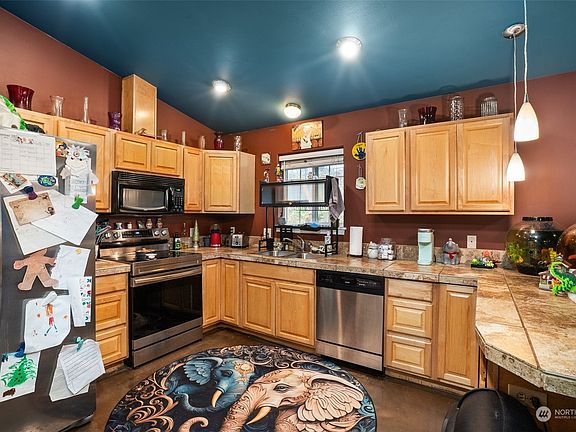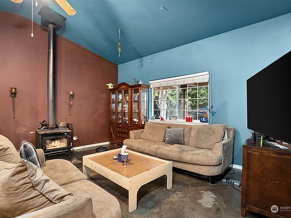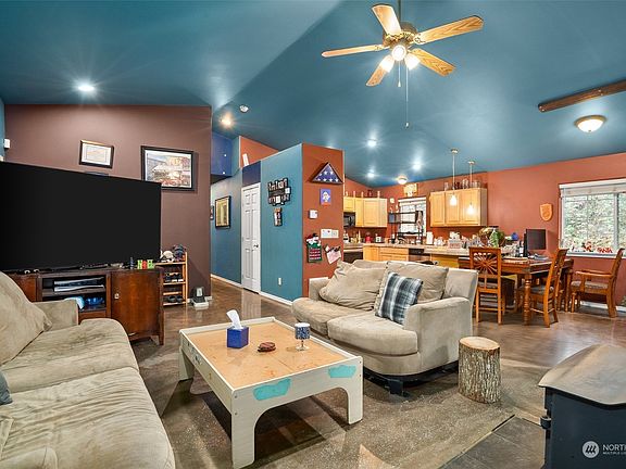Nestled at the end of a quiet road, this charming 3-bedroom, 2-bath rambler offers ultimate privacy and tranquility. Set on 1.25 acres of fully fenced land, surrounded by lush trees, the home boasts a spacious open feel with vaulted ceilings and durable, low-maintenance concrete floors in the living room, kitchen, and hallway. The well-equipped kitchen features ample cabinet space, a pantry, and a convenient breakfast bar. French doors from the dining area lead to a deck perfect for BBQs and outdoor dining. Enjoy year-round relaxation on the covered front porch. Additional features include RV/boat parking, a double-car garage, and a utility room.