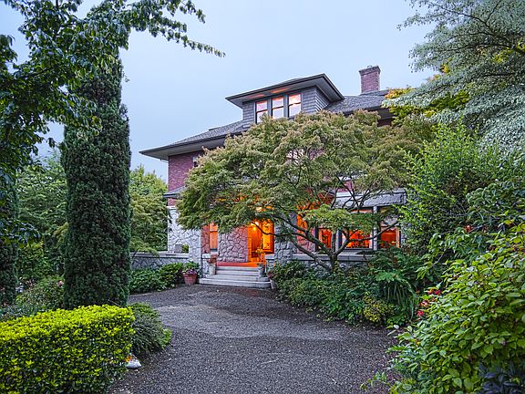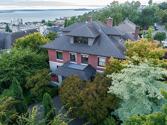 A classic four square home with elements of Beaux-Art design throughout the interior... modified gothic arches, iconic columns, and Art Nouveau carvings on the grand staircase and Newell posts. All fireplaces are American art tiles. Built in 1909, as one of 5 unique granite homes on Queen Anne by enigmatic designers Bebb and Mendell for the Robinson family, who owned a wholesale grain, hay, and feed firm. The home was also the Japanese Consulate before WWII. With multiple curb cuts, a circular driveway, ample off street parking and a detached garage this home is unique for ease of parking on Queen Anne Hill. A large front door opens to high boxed ceilings and beautiful large light filling windows. All restorations have been faithfully executed by accomplished craftsmen. The parlor walls have been hand painted to match period wallpaper. Each room and the floors are finished with old growth, exotic hardwood including Paduak, Narra, White Oak, and Apitong. It can be safely said nothing was missed. 7 large bedrooms and 6 bathrooms, a utilitarian farm house kitchen round out excellent living spaces. A bar room and exquisite dining room with an original William Morris tapestry make entertaining an event. Down stairs there is a large poolroom/ media den with a museum worthy tile fireplace made by The Moravian Pottery & Tile Works. Boasting a large 12,800 SF corner double lot, this home can lend it self admirably to the newly proposed ADU zoning codes and can if needed provide excellent income potential.