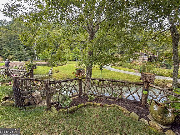 Discover the pinnacle of luxury RV living at 111 Wildflower Creek Dr., Scaly Mountain, NC 28775, within the exclusive Wildflower Creek Motor Coach Resort-a gated haven for Class A motor coaches where serenity meets sophistication amid the high-elevation mountains of Western North Carolina, offering cool summers with highs in the low 80s in one of the Southeast's most coveted destinations. This meticulously crafted creekside property, offered fully furnished with only a few personal exceptions, features a stunning custom-built coach house that redefines compact elegance, blending rustic charm with high-end amenities for an unparalleled retreat. Step inside to an open-concept great room that exudes warmth and refinement, with vaulted pine ceilings, recessed lighting, and a stone-accented fireplace that invites cozy evenings by the fire. The space flows seamlessly into a gourmet kitchen, a culinary masterpiece boasting pristine quartz countertops, soft-close cabinets and deep drawers, pull-out pantry storage, and top-tier appliances, including a Bosch dishwasher and KitchenAid suite. Pendant lights in artisanal glass hues illuminate the expansive island with leather bar stools, perfect for morning coffee or intimate gatherings, while Douglas Hunter blinds frame the windows, allowing natural light to dance across the wood-plank flooring. Ascend the exquisite wooden spiral staircase to the loft bedroom, a private sanctuary featuring a plush King Size Sleep Number bed, a comfortable sitting area with a recliner, and a dedicated small office nook-ideal for remote work or quiet reflection. The luxurious full bath impresses with its tiled walk-in shower, blending spa-like indulgence with practical design. Venture outdoors to the covered patio, a true extension of your living space, equipped with a premium Blaze outdoor kitchen complete with stainless steel grill, griddle, and ample storage for al fresco dining under the stars. Electric Phantom screens provide effortless privacy and protection, enhancing gatherings around the wicker dining set with its marble-top table, all while overlooking lush gardens, a tranquil pond, and forested vistas. Gather around the built-in outdoor Brio fire pit-smokeless for ultimate comfort-on the expansive lawn, flanked by Adirondack chairs and overlooking the fantastic grounds and 1800's log cabin community building, amid nature's symphony. At the core of this exceptional lot is the premium RV pad, engineered for effortless luxury with full hook-ups including 50-amp electrical service, fresh water, and sewer connections, accommodating even the grandest coaches with wide, maneuverable access. A spacious, electricity-wired storage shed stands ready for your gear, tools, or hobbies, ensuring every detail enhances your nomadic lifestyle. This is more than a lot-it's a gateway to elevated adventures in one of the Southeast's most coveted resorts. Embrace the extraordinary today.