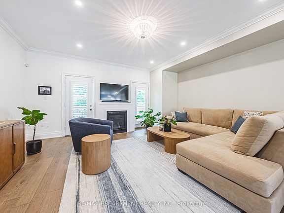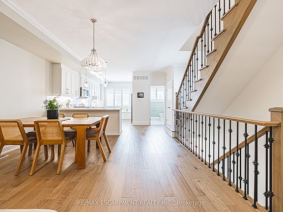Stunning end unit town located in desirable sought after Ancaster village, walkable to coffee shops, fabulous dining, french bakery, summer farmers market, memorial arts centre, trails, schools, grocery and more! Meticulously maintained in like new condition, freshly painted with California shutters throughout, this home is turn key. The main level welcomes you from the covered porch into a flex space, currently used as home gym with double door walk out to exposed aggregate patio. Inside entry from garage. Convenient 2 piece bath with quartz counter. On the main level, you will find an elegant and exceptionally spacious living room/kitchen with 9 ft ceilings, crown moulding, hardwood floors. Living room is centred around gas fireplace with double door access to deck with bbq gas line and facing ravine. Dining area and kitchen peninsula offers ample room for entertaining. Crisp white kitchen with quartz counters, premium hardware, pearl finish textured tile backsplash, stainless steel appliances including gas stove, ample kitchen cabinet space with pantry. Main level 2 piece bath with quartz counter vanity and hexagon tile floor. Upstairs you will find three bedrooms, laundry, 2 full baths. Primary suite with walk in closet, ensuite with walk in glass shower, two large windows facing ravine. Additional 4 piece bath with quartz counter vanity and tub. No rental Items! Enjoy the Ancaster lifestyle with this beautiful move in ready home.