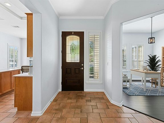 This Del Webb-built Trinity floor plan home sits on a private stretch of Sun City greenbelt — no backyard neighbors here. A stylish 8’ glass front door opens to tall 10’ ceilings and an open, comfortable layout. The kitchen includes Corian counters, a center island, Bosch appliances, gas cooktop, pantry, and a sunny bay window breakfast area. In the living room, a cozy fireplace is flanked by built-in shelves, ideal for displaying books or decor. Dark bamboo hardwood flooring adds warmth to the living and dining areas, study, and both bedrooms. Plantation shutters plus updated lighting and ceiling fans throughout bring a fresh, modern feel. The owner’s suite features a bay window with peaceful greenbelt views. The main bath has been upgraded with a jetted tub, frameless glass shower, and dual vanities with quartz counters. A separate laundry room includes a wash basin and extra space perfect for hobbies, crafts storage. Out back, the fully fenced yard opens to a deep greenbelt, offering plenty of privacy and space to relax. Bonus features include a decked attic and a brand-new roof installed in October 2025! 2011 HVAC. 2009 Water Heater.