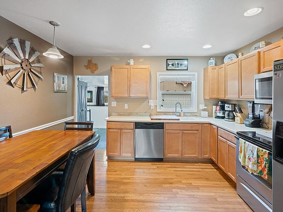 Located near groceries, restaurants, and parks, this home is a gem! Going into the adorable entry with new flooring, you'll find plenty of space for shoes, coats, and backpacks. Then you're met with all the cozy good feels when you enter the kitchen. Connected to the living room, you get the natural light from both sides of the home while enjoying the Corian countertops and beautiful cabinets. The gorgeous hardwood floors throughout the first level give a feeling of warmth and nostalgia. Through the living room is a roomy full bathroom and a bedroom with an attached room that could be used as an office, baby room, or your dream closet! Downstairs is a family room with a cool industrial feel, an egress bedroom, and another room that could be used as a bedroom or office space. The water heater is newer and the washer and dryer stay with the home! Moving outside you'll find a fenced backyard you'll never want to leave and a spacious 2 car garage with a dog run/kennel on the side, complete with doggie door leading into the garage. Whether an outdoorsman, a family starting out, or just someone ready for a GREAT home, you've got to see this house in person!