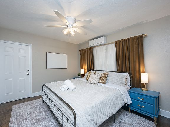 Comfortable bedroomGranite countertopsLarge windowsCeiling fanStylish gold drapesElegant hardwood flooringNatural light
