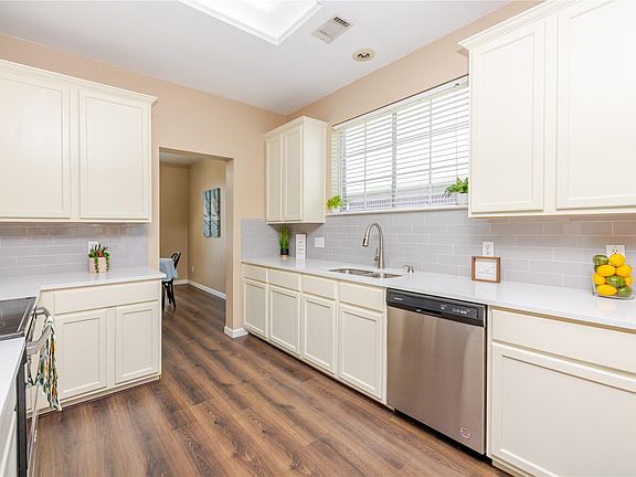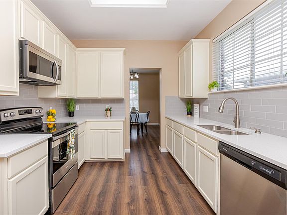 Cozy gas fireplaceLaminate flooringFormal dining roomNew countertopsStunning tile backsplashFully fenced backyardSleek stainless steel sink