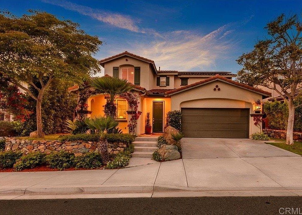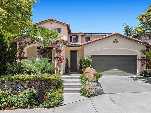 Desirable Terraza Home in San Elijo Hills. Gorgeous curb appeal, beautifully upgraded and eco-conscious with owned solar, this spacious residence offers 3 bedrooms plus a dedicated office/desk area and 2.5 bathrooms, 3 car garage - built in 2010 and boasting 2,182 Est. SqFt. The gourmet kitchen features granite countertops, stainless steel appliances, and a center island opening to an inviting family room with fireplace - perfect for everyday living and entertaining. The dining and living room combination showcases elegant tile flooring and custom built-in cabinetry. Upstairs, enjoy laminate wood flooring throughout, including the office/desk area, with tile in the bathrooms and laundry room. The expansive primary suite includes walk-in closet and a tranquil bath with soaking tub, dual sinks and walk-in shower. Custom built-in cabinetry is thoughtfully integrated throughout the home. Additional highlights include ceiling fans, air conditioning, tankless water heater and fully paid solar system for energy efficiency. Set on a private, pool-sized lot, the outdoor space features a large patio, spacious lawn, raised play area, mature landscaping and several fruit trees - ideal for entertaining, relaxing and play. The tandem 3-car garage includes overhead storage racks for added utility. Washer/Dryer/Fridge and Solar System are included. LOW MELLO ROOS and HOA! Located within the boundaries of the highly desirable Double Peak School. The San Elijo Hills community features: - Top-rated schools - Ball parks & soccer field - Picnic areas & playgrounds - Dog park & community center - Town center with stores and shops, restaurants and eateries, 18 miles of scenic trails & a 19-acre park - Over 1,000 acres of open space Enjoy the Southern California Coastal lifestyle, a short drive to the beaches and everything San Diego County has top offer. Seller to select services. Mello-Roos fees are estimated. All MLS and marketing information is approximate and not guaranteed.