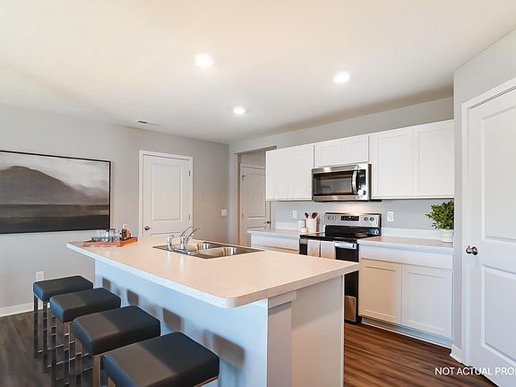 The main living area features a great room, dining space, and modern kitchen with stainless steel appliances, a center island, and a walk-in pantry.