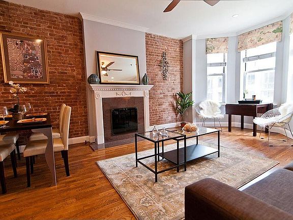 NO BROKER'S FEE. Could this be your new 'home sweet home'? This 3rd floor walk up apartment is warm, spacious and charming and features hard wood floors, exposed brick walls, and a wood burning fireplace. With 1250 square feet of living space it offers 2 bedrooms and 2 bathrooms (one en-suite), an open plan kitchen and living room and a separate dining room. There is a washer/dryer in the apartment, central heating, window A/C units and basement storage.