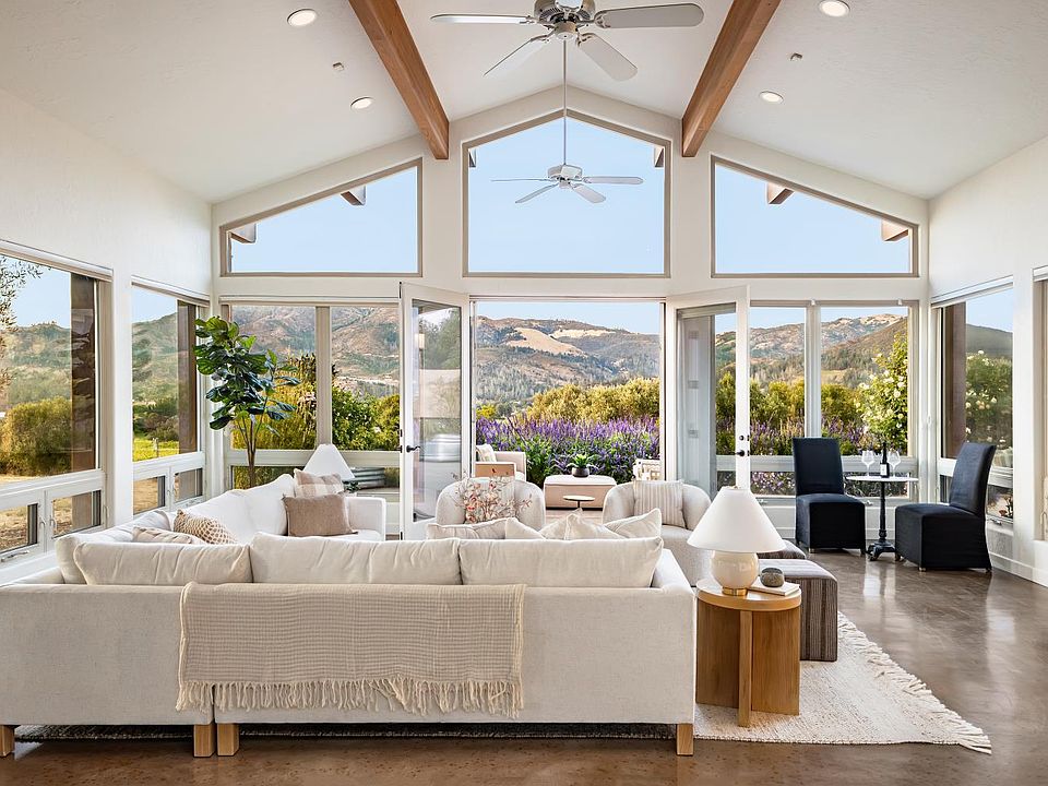 Perched atop a private knoll in the heart of Kenwood, this nearly 14-acre estate captures the full beauty of Sonoma Valley from every angle. With panoramic views of the surrounding mountains, rolling vineyards, and open skies, the property offers a rare blend of seclusion, natural beauty, and Sonoma Valley wine country authenticity. The single-level main residence features 3 bedrooms and 2 bathrooms, designed with an open-concept layout that connects effortlessly to the landscape. At the heart of the home, the great room showcases a soaring cathedral ceiling that perfectly frames Hood Mountain, while the chef's kitchen impresses with an oversized island, walk-in pantry, and expansive windows that bathe the space in natural light. A detached 3-car garage includes a spacious area aboveideal for a home office, art studio, or workout space.Located in one of Kenwood's most treasured communities, you're just minutes from world-renown wineries, Sugarloaf trailheads, and the town's emerging culinary sceneincluding destination-worthy Michelin star restaurants and farm-to-table experiences. For those seeking space, soul, and the essence of Sonoma Valley wine countrythis is it.