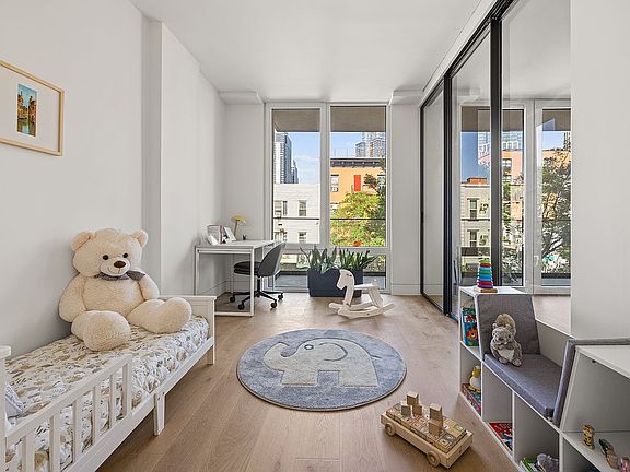 Accessed from the living room, one of the three large bedrooms features floor-to-ceiling windows with views of Manhattan Avenue. With a spacious double closet, stylish pendant lighting, and space for a Queen or King bed- this room can serve as a third bedroom, a dedicated home office, or a seamless extension of your living area. A modern glass paneled sliding wall allows you to easily open the space for a more integrated layout or close it off for added privacy.