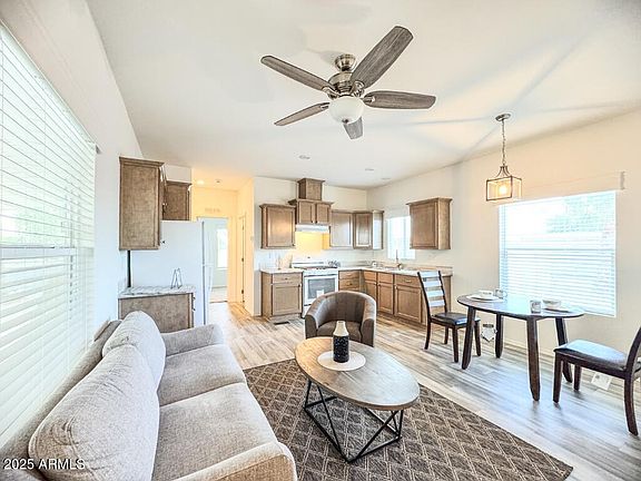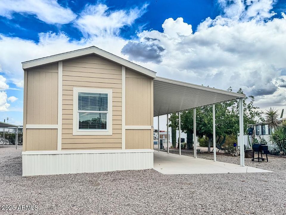 Experience ''like new'' living in this never-lived-in 2023 Cavco 2-bedroom, 2-bath manufactured home in the desirable 55+ Roadrunner Estates in Arizona City, AZ. Enjoy an open-concept layout with luxury vinyl floors, 9' flat ceilings, dual-pane low-E windows, & a split bedroom design for privacy. The kitchen offers a gas range, & refrigerator, while the primary suite features a step-in shower. Outdoors, find a high-profile carport, a matching storage shed, & low-maintenance landscaping. Located on a cul-de-sac with space between homes, residents enjoy a pool, & dog area. Land lease of $550/month covers water, sewer, trash, & common area maintenance. Ideal for retirees seeking affordable, low-maintenance Arizona living. Approval for residency required; furnishings negotiable.