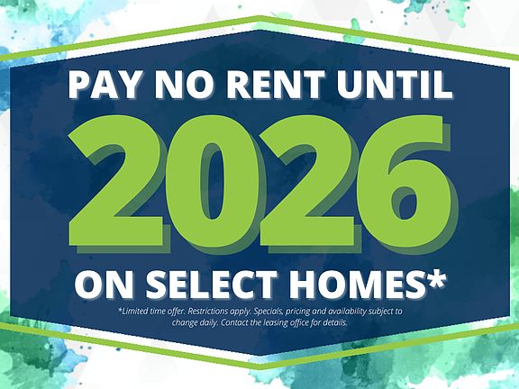 • Special offer! Pay No Rent until 2026 on select homes! *Limited time offer. Restrictions apply. Specials, pricing and availability subject to change daily. Contact the leasing office for details.