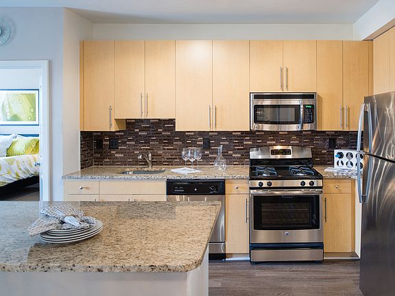 - Exterior features: , Balcony, Bicycle storage, Building-wide Wireless, Business Center, Car Care Facility, Center island*, Granite countertops*, Green Certified, Hardwood-style plank flooring*, Modern lighting*, Nine-foot ceilings, Package Receiving, Six-foot windows, Split Rent Payments with Flex, Stainless steel appliances*, Tile backsplash*