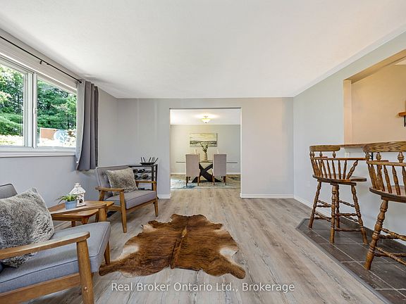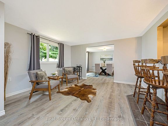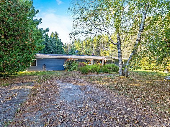 Nestled behind a screen of mature trees, this charming ranch-style bungalow offers a beautifully landscaped front yard with cozy sitting areas. The inviting covered front porch leads into a spacious kitchen, complete with stainless steel appliances and a breakfast bar that opens to the living room. A separate dining room provides the perfect setting for family meals. The expansive family room, featuring a cathedral ceiling, has a walkout to a large wooden deck, surrounded by vibrant perennial gardens and a pergola. The main floor hosts three bedrooms and a full bathroom. Outside, a detached outbuilding with a loft and workshop, fully equipped with electricity, offers plenty of space for hobbies and storage. The serene backyard includes vegetable gardens and a personal orchard with cherry, pear, and apple trees.