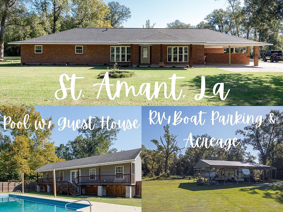 Prepare to fall in love with this incredible 4 bed, 2.5 bath, 2,200 living sq ft home that was completely remodeled sitting on 2.53 ACRES in Riverside Estates! The heart of the home is the spacious kitchen offering ample cabinetry, a convenient breakfast bar, gas stove, and stainless-steel appliances. A charming formal dining room overlooks the pool and features an adorable barn door with extra shelving for storage. The primary suite offers two closets and a relaxing retreat with an updated en-suite bathroom boasting a sleek custom shower and double vanity. Each guest room is generously sized with big closets and easy access to a beautifully refreshed bathroom with a tub/shower combo and a linen/storage closet. The massive laundry room provides room for organization, hobbies, or even an extra fridge —whatever fits your lifestyle! Laminate wood flooring in the bedrooms pairs perfectly with ceramic tile throughout the main living areas and hallways, offering durability and style. No Carpet! Step outside to your personal oasis—complete with a lined chlorine pool ready for summer fun, a spacious covered patio for outdoor entertainment, and a 20x12 storage shed. You’ll also love the impressive 40x60 camper cover with a full camper hookup that will remain—perfect for RV lovers or extra covered parking for other toys or boats. And that’s not all! The detached in-law suite/pool house is a true bonus with 852 living sq ft featuring 2 bedrooms, 1 bath, living area, its own kitchen with a stainless-steel fridge and electric stove, and a mini-split A/C—ideal for guests and all gatherings! 100% Financing Available! No HOA! Seller willing to negotiate buyer allowance for the pool liner. Conveniently located near Airline Highway, Walmart, Rouses, restaurants, A rated public schools and so much more! Beautifully updated, move-in ready, and designed for both comfort and entertainment, this home truly has it all! Schedule your private showing today!