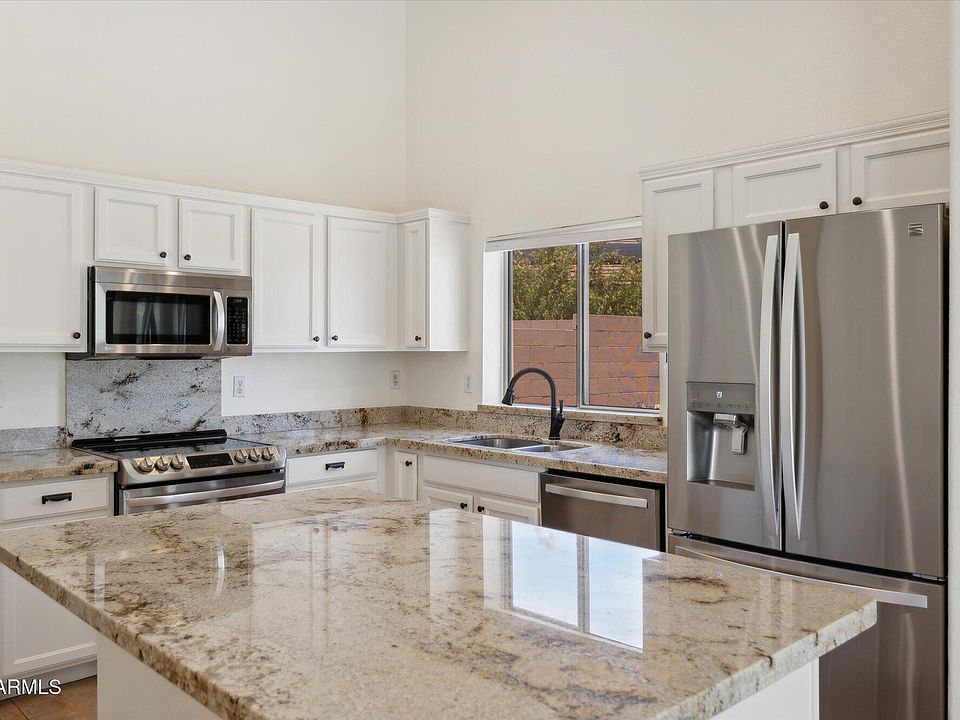 This beautiful home in gated Canyon Ridge sits on over 10,000 sq ft lot with an RV gate and extended covered patio. Inside, enjoy vaulted ceilings and an updated kitchen with custom granite countertops and all stainless appliances, including a French Door Smart Fridge and induction range. The primary bedroom has a full bath with a large shower and a separate garden tub, and a spacious walk-in closet. The washer and dryer are also included. The HVAC was replaced in December 2023, and the exterior was painted in 2022. The garage is wired for 220. Enjoy Peoria school district with City of Surprise property taxes. *Virtual staging used to spark your imagination!*
