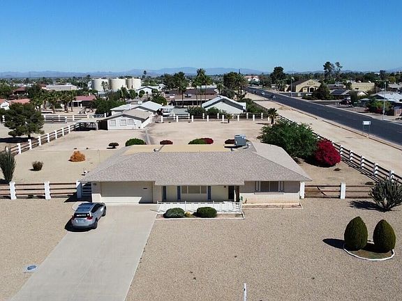 This Rancho Estates home, with 3 bedrooms and 2.5 baths, features a number of benefits for a buyer looking for an acre+ lot. These include a large family room with arcadia doors leading to a spacious covered patio with mountain view, a remodeled eat-in kitchen with granite countertops, stainless Whirlpool appliances, tile backsplash and a detached 4+car garage/workshop/man cave with alley access. More features: 3 a/c units (1 in attached 2 car garage, 1 in front of house, 1 in rear of house), 2 water heaters, a water softener, desert landscaping front and back, 3 citrus trees, a huge walk-in closet in the master bedroom and a walk-in shower in the master bath. Carpet and tile throughout plus a front entry with parquet flooring. Dual pane windows. Sun City is an age 55+ adult community. See document section for Adult Community Addendum and On-Site Wastewater Addendum. Nine recreation centers, 9 golf courses and hundreds of opportunities for senior adults to engage in their community.