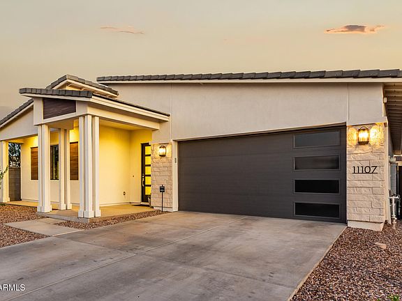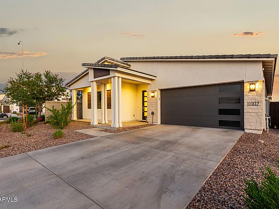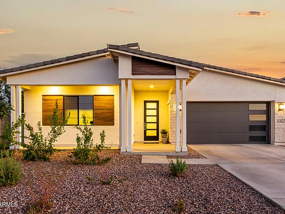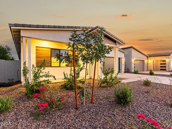 This attractive corner lot gem features a 3-car garage and low-care front yard. Enter to find a welcoming hallway leading to the modern open floor plan enhanced by tile flooring, upgraded carpet, pre-wired surround sound, and wide sliding glass doors that create a seamless indoor-outdoor living experience. Gourmet kitchen is fully equipped with recessed lighting, a walk-in pantry, ample cabinetry, zelige tile backsplash, stainless steel appliances, quartz counters, whole home filtration and a large prep island with a breakfast bar. Venture to the romantic main retreat, providing plush carpet, an ensuite with dual sinks, and a walk-in closet. The garage features epoxy flooring and the backyard is a blank slate- perfect to create your own paradise! Home still under 12 month warranty! HOA approved backyard design is available upon request