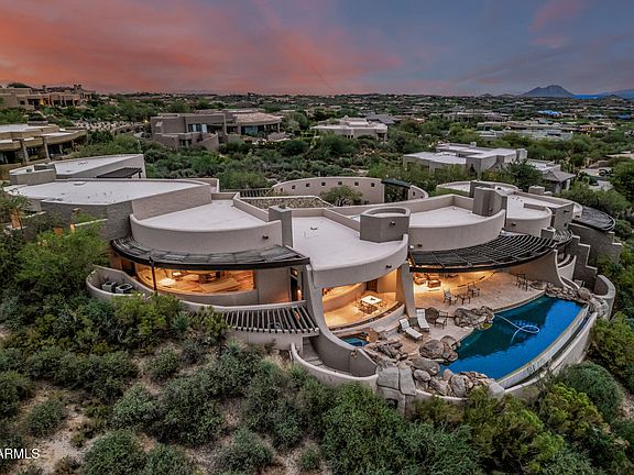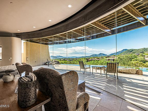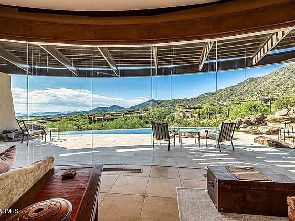 3 acres on 2 prime lots in Apache Peak! Glass walls frame this estate, Continental Mountains & Phoenix. Int/ext travertine floors, monolithic stone stair treads, counters, thresholds & hearths, imported enmeshed boulders, solid wood lintels, sills & shelves, Jurassic Gold granite kitchen counters, climate controlled wine cellar, new roof, new programmable ambient lighting & sound. Bedrooms each include fireplace, private patio, walk-in closet & en-suite bath clad w/travertine, Master Suite w/Office & Exercise Rm. Ext Kiva court, shaded parking, 3-car garage, negative-edge lap pool w/cascading water fall, spa, ext bath, shower & fireplace. Masonry walls, surplus ceiling insulation, operable windows, roof exhaust, overhangs, fin walls, 9 gas fireplaces, 7 zone HVAC. Golf Membership avai The luxurious primary suite showcases soft carpeting, a romantic fireplace, a lavish private bathroom with double vanities, and a large walk-in closet. Fall in love with more amenities, including skylights for ample natural light, a bonus room, and a guest house for hosting visiting loved ones. Enjoy enchanting sunsets on the rooftop deck, which offers majestic mountain views in the distance. Imagine tranquil evenings on the covered patio, boasting an outdoor fireplace, a built-in BBQ, travertine pavers, and a refreshing pool. This gem will sell fast!
