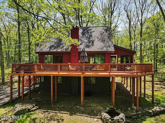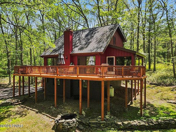 **Escape the Rat Race: Your Tranquil Pocono Retreat Awaits!**Tired of the hustle and bustle of New York City or New Jersey? Discover this expansive contemporary move-in ready retreat, where comfort and style seamlessly unite. Upon entering, you'll be captivated by stunning hardwood floors throughout. The living room features soaring cathedral ceilings, a cozy wood stove, and two new, large, sliders that bathe the space in natural light.Unwind in the heated sunroom with its large windows and charming knotty pine ceiling, or entertain guests on your spacious new deck. The dining room and kitchen offer newer appliances, ample cabinets and counter space, perfect for your culinary creations.The home includes two bedrooms and two bathrooms on the upper level, while the full, finished walk-out basement offers another full bathroom, ready for your personal touch. New roof in 2016, new gutters in 2023, new exterior paint, many updates including a huge new deck!The lower level boasts a versatile family room that can easily be transformed into additional bedrooms, complemented by a luxurious, full bath with a steam shower. A whole house generator comes with the home so you'll have power no matter what Mother Nature throws at you.Nestled on a double lot of 1.45 acres in a serene cul-de-sac, this home offers the ultimate in privacy and tranquility within a gated community in the Poconos. Pocono Ranchlands is a rare jewel among Pocono communities, featuring two large pools, tennis and basketball courts, ponds, lakes, a clubhouse, 24-hour security, and winter road snow removal. Enjoy FREE horseback riding for members in good standing and their guests, with stables and trails abutting the PA State game-lands, just across from the community's main gate.Located just a 2-hour drive from New York City or New Jersey, this is the perfect escape to serene living. Don't miss your chance to experience the tranquility of this beautiful property!