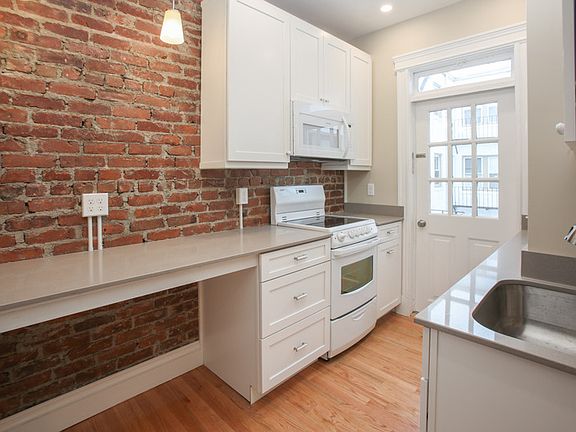 New eat-in-kitchenBreakfast barExposed brick wallsGranite countertopsBeautiful brownstone buildingRecessed lightingCeiling fans