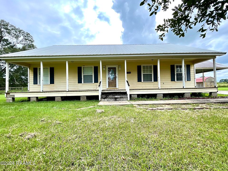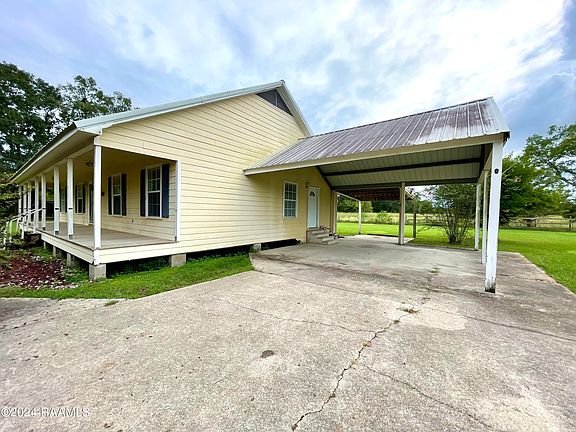 Acadian-style home for sale on 5 acres of land. This property has three bedrooms and two baths. The front of the home has a porch from corner to corner, with an attached two-car carport. Large living room space for family and guest gatherings. The kitchen has an island bar for stool seating next to the dining area. Its inside laundry room is complemented with inside cabinetry. The master bedroom has a master bathroom. The home is set back from the road, and there is plenty of acreage behind it. The area provides opportunities for a variety of outdoor activities, as well as space for equipment, horses, and farm animals. Schedule a showing!