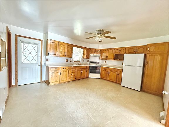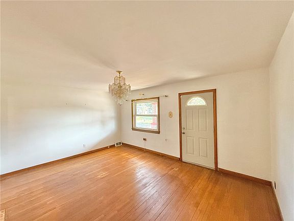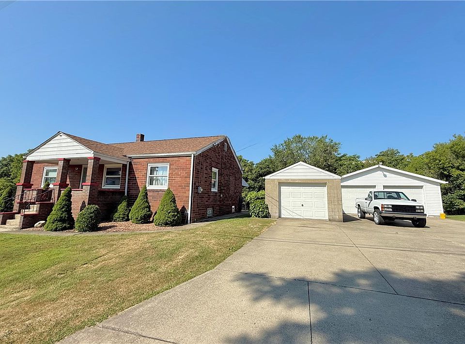 Welcome to this charming and well-maintained solid brick ranch, ideally situated on a spacious double lot in desirable Shenango Township. This property offers the perfect blend of privacy, character, and functionality. Enjoy the serene setting of your private backyard oasis. The home boasts an expansive concrete driveway leading to two separate detached garages—a one-car garage and a large two-car garage, providing ample space for vehicles, hobbies, or storage. Inside, you'll find a warm and inviting layout featuring a cozy yet spacious living room, gleaming hardwood floors throughout, and a large eat-in kitchen that opens semi-formally into a versatile third bedroom or optional formal dining room—perfect for entertaining or everyday living. Down the extra-wide hallway with double closets, you’ll find an updated bathroom with a walk-in shower and two more generously sized bedrooms. The full basement adds even more potential with a cool storage cellar and an authentic barrel wine press.