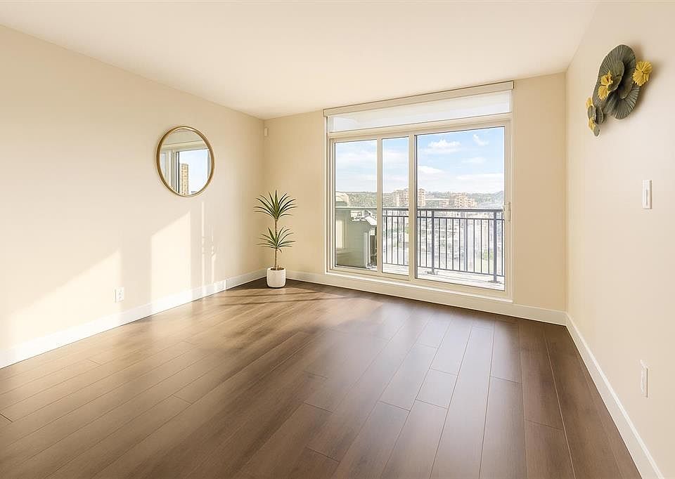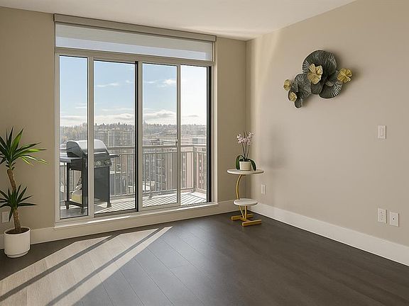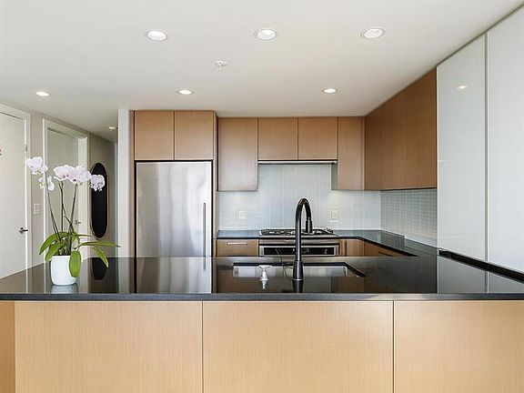 Open layoutGas cooktopFull-height cabinetsFloor-to-ceiling south windowsPrivate balconyIn-suite laundry