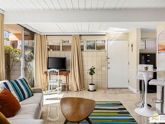NEED A VACATION GETAWAY? THIS IS IT! Welcome to the iconic Ocotillo Lodge, a piece of Palm Springs history! Once owned by Gene Autry and frequented by Hollywood stars like the Rat Pack, this 1957 gem radiates unique charm. This bungalow unit, originally a hotel room, features modern updates completed in 2021, including stylish kitchen and bathroom cabinetry, countertops, fixtures, and fresh flooring and paint throughout. The Southwest-facing windows are equipped with UV glazing for enhanced comfort. Residents can enjoy the stunning champagne cork-shaped pool, relaxing hot tubs, and the inviting Sunshine Bar, perfect for gatherings with breathtaking views of the San Jacinto Mountains. With all utilities included in the HOA dues--cable and internet too--living here is both convenient and carefree. As part of an approved class 1 historic district, your condo may also qualify for tax reductions under the Mills Act. Embrace the desert resort lifestyle and become part of the vibrant history of Palm Springs!