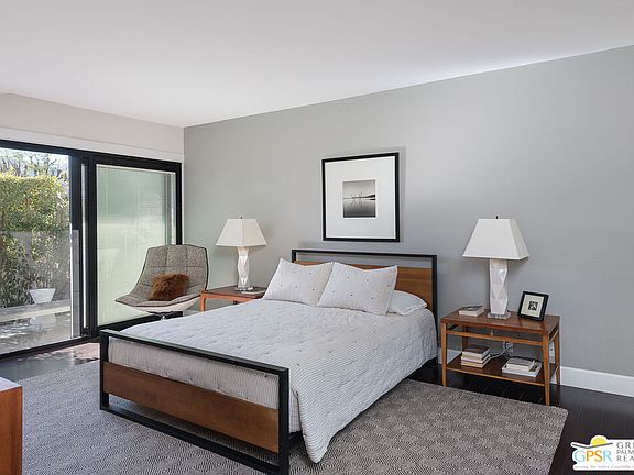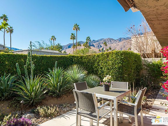 Beautiful modern single-level condo at Ramona Villas, located in the Warm Sands neighborhood of Palm Springs. Close to Downtown on land you own. It features an open floor plan, updated living space and 2 bedrooms and 2 bathrooms. Large windows and sliding doors allow natural light into living areas. The remodeled kitchen has ample storage space, quartz countertops and contemporary appliances; gas stove, refrigerator, dishwasher. This condo has its own washer/dryer and tankless water heater. The secluded patio is oversized and is surrounded by a Ficus hedge, desert plantings, citrus, flowering shrubs and landscape lighting. The Patio also includes a retractable awning and a large entertaining space, perfect for enjoying morning coffee or evening sunset views of the San Jacinto mountains. The Ramona Villas community offers extensive amenities, including a resort like saltwater swimming pool, spa, fitness center, tennis court, clubhouse, and meeting room. Plus, covered parking with a storage cabinet and electric vehicle charging stations. Perfect for your vacation home or a primary residence. Can be available furnished outside of escrow.