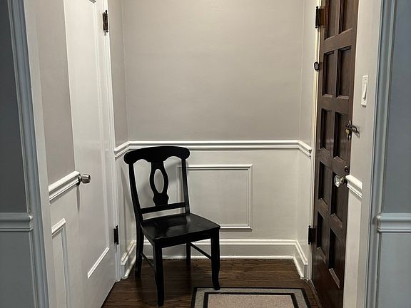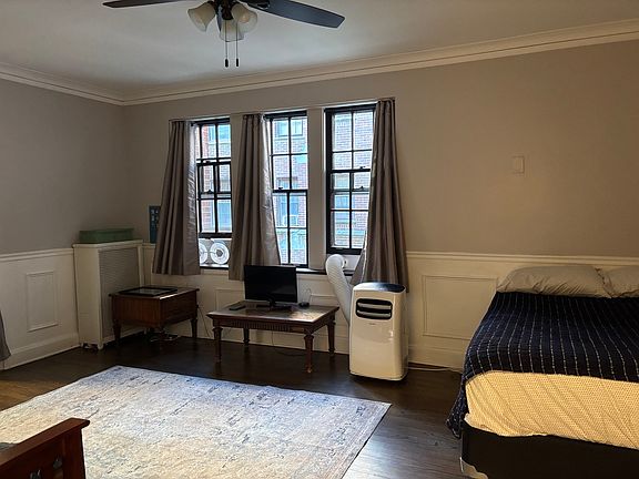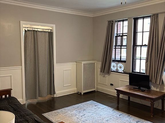 Defined eating areaOversized living spaceCrown moldingDark wood floorsAdditional storage spaceVintage courtyard buildingNicely sized closets