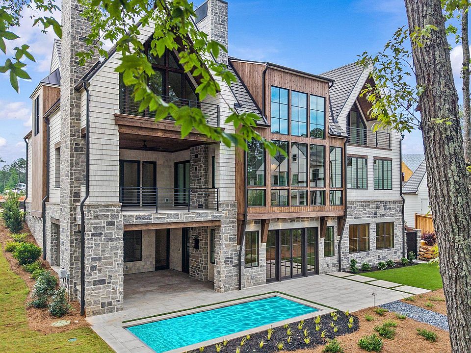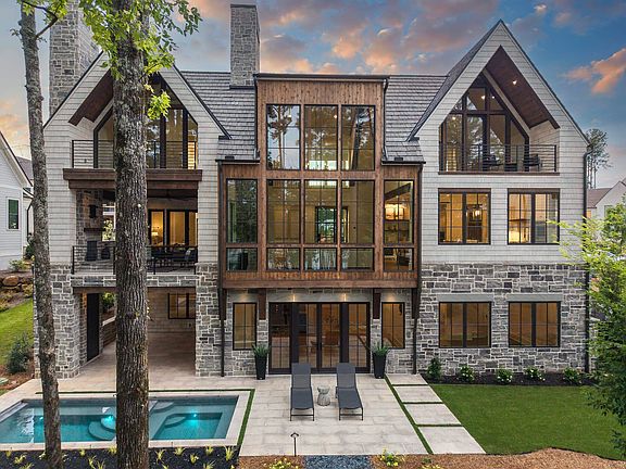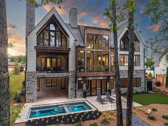LAKE TAHOE INSPIRED NEW CONSTRUCTION HOME IN RICHLAND POINTE VILLAGE STEPS FROM THE WATER AND RESORT STYLE AMENITIES, THIS LAKEFRONT HOME HAS IT ALL. This move in ready custom home offers an exceptional lakefront lifestyle in Reynolds Lake Oconee and is the only lakefront home with a private max dock currently available in Richland Pointe Village. Designed by Norwood Architects and built by DreamBuilt, this 5 bedroom, 5 and a half bath home spans three levels with stunning lake views from nearly every room. An expansive front porch with stone floors and custom cedar columns creates a warm welcome. A 10 foot custom metal and glass front door opens to bright, airy interiors. Just beyond the foyer, the great room impresses with soaring two story Marvin specialty windows framing lake views, vaulted ceilings with wood beam accents, white oak floors, and a limestone fireplace with stone cast mantle. Flowing from the great room, the chef’s kitchen features quartzite countertops and backsplash, an eat in island, custom vent hood, Bell custom cabinetry, and top tier panel ready appliances including Wolf, SubZero, and Cove. A wet bar with under counter wine cooler and space for a coffee station, plus a walk-in pantry with appliance garage, complete the space. The covered patio off the great room includes a built in outdoor kitchen with grill, prep counter, and beverage cooler, perfect for al fresco dining. The main level also offers a spacious guest/primary suite, ideal for single level living. A built in mudroom, laundry room, powder room, and framed shaft for a future elevator add convenience. Upstairs, two lake facing bedrooms open to private covered balconies and feature angled Marvin windows, en suite baths, and custom Artisan closets. One functions as a luxurious secondary primary suite. A spacious flex area at the landing allows for a sitting area, library, home office, or lounge. The terrace level is made for entertaining with a full bar, SubZero beverage center and ice maker, wine cellar rough in, and a second laundry. Two additional bedrooms with full baths complete the lower level. Hartstone decking surrounds the pool and spa, with low maintenance turf providing year round greenery. A stone aggregate path leads to the private max dock. The Brava synthetic cedar roof, Texas limestone and cedar shingle exterior, designer lighting, built in speakers, and extensive millwork reflect the home’s quality and craftsmanship. Membership Available.