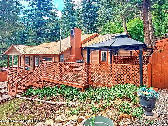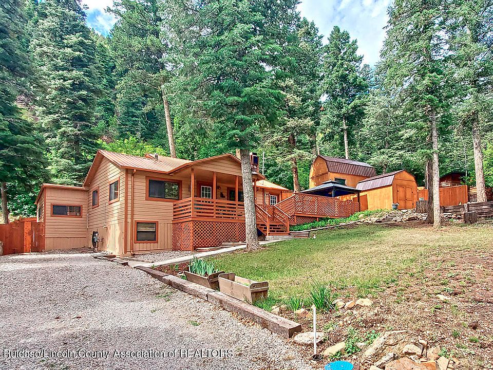 'Upper Canyon'' cabin in the Mountain Resort of Ruidoso!! This mountain cabin- 3 Bedroom 2 Bath, partially remodeled w/ knotty pine. Located across from the ''Rio Ruidoso!!'' Often you can enjoy listening to the river run. Relax on the decks on the many cool, sunny mornings to enjoy the blue sky, the tall trees and the abundant wildlife grazing. Entertain inside or under the cover of the gazebo. Lots of Natural light! Kitchen opens to living & dining area; w/breakfast bar, electric convection oven w/gas cook top. Stone fireplace w/ insert/ blower. + Lot size .28. Fenced Back yard:6 ft Cedar Privacy fence. 2 Storage sheds;1 is insulated 10x20 w attic; 2nd Storage shed is 8x10 A Heated mechanical room w/water cutoff. Metal roof, Excellent parking. Water catchment tank