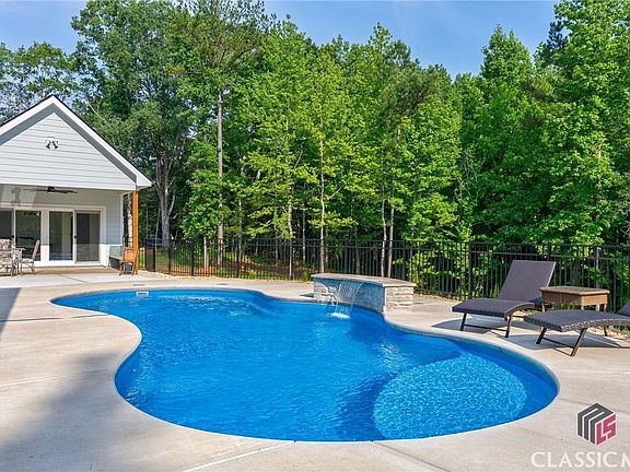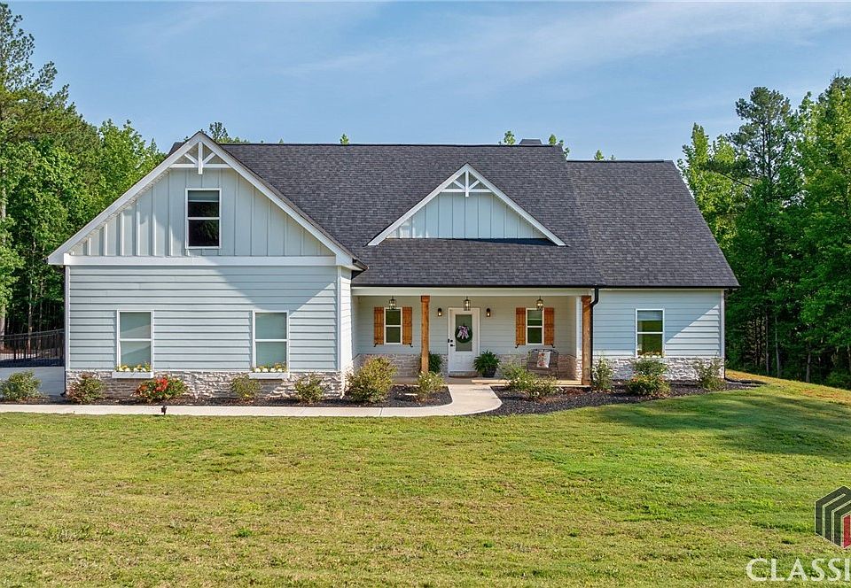 Beautiful Modern Farmhouse on 5 Acre Lot with Pool, Pool House & Huge 30 x 50 Metal Building! This is the one you've been dreaming of! Designed for comfortable living & entertaining you'll find the rooms in this home are bright & spacious and the living areas flow seamlessly with the rear covered patio & pool area. Entry foyer is nice and wide, offering a great space to greet your guests. Coat closet and half bath are conveniently right off the foyer. The open-concept living area is a delight! Living Room features an elevated ceiling with stained beams, stone fireplace and wall of windows with double sliding doors that lead to the outdoor living area. The kitchen has popular white shaker style cabinetry, quartz countertops and wide island open to living room with plenty of space for barstools. Dining area offers ample room for a table and hutch if desired. Between the garage entry and kitchen there is a walk-in pantry as well as “drop zone”. The primary bedroom suite encompasses the entire right wing of the home. The bedroom offers rear and side yard view from the 4 windows. The ensuite bathroom has a wide double vanity, custom tiled shower, separate tub and a walk-in closet. Also on the main floor are bedrooms 2 & 3. They make up the left wing of the home and share a hall bath. The staircase is located off the foyer and leads to the 4th bedroom, 3rd full bath as well as a big bonus room! This layout works well for so many life stages with all the separate spaces. Moving outdoors, you'll find the design for comfortable living & entertaining continues! Oversized covered patio offers plenty of room to relax in the shade. The pool is 14x34 & has a waterfall feature creating a tranquil setting against the wooded backdrop. Next to the pool there's a brand new pool house with full bathroom - perfect for entertaining or to house guests! Last but not least, for the enthusiast of just about anything, the expansive 30x50 building sits on a concrete slab offers plenty of room for all sorts of hobbies & has lean-to covered storage on both sides! All this is located in the quaint AG-zoned community of McLeods Estates, where all lots are around 5 acres and there is no HOA. Conveniently located just a few miles off 78 almost equidistant from Monroe, Athens & Watkinsville! Make your appointment to view this great home today!