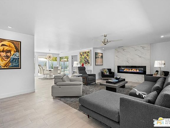 This is NOT a flip. Seller spared no expense in the remodel for his own use, but plans changed and now this gem will belong to a new lucky owner!!! The mid-century Movie Colony home underwent a complete transformation in '23-'24 including an elegant stone exterior and the entire interior was refinished with a architectural grade-5 smooth drywall finish. Upgrades: all new doors and handles in and out, contemporary floor tile throughout, all new lighting and ceiling fans, and custom made architectural base. Four new Milgard sliding patio doors all face the majestic mountain view and a 2024-built contemporary Pebble Tech pool and spa by famed pool designer Architectural Blue with Pentair equipment. The kitchen is graced with contemporary high gloss European cabinets, quartz counters (also in 3 baths and laundry), stunning backsplash, stainless steel 36" professional range with hood, 4-door/drawer counter-depth refrigerator and built in microwave. There are 3 ample bedrooms and 3 richly finished baths, all with double showerheads and Toto toilets. The 24' laundry/bonus room could be a wine room, office or pantry. 16 owned solar panels from Hot Purple Energy power the 2024 electric panel and the electric car charger in the fully finished garage.