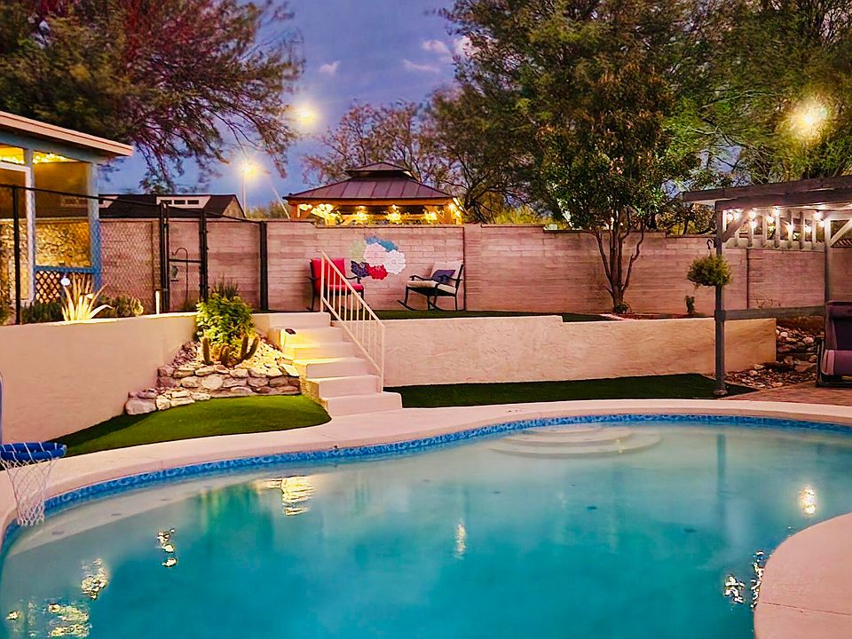 Welcome to your dream home! Upgraded 4-bedroom, 2-bath home with an incredible list of features and NO HOA! Designed for flexibility, comfort, and income potential, this home truly has it all. Enjoy owned solar panels and no electric bill. Your outdoor oasis includes a sparkling heated pool for year round swimming, a bonus yard complete with a gazebo, lush turf and paver patios providing plenty of space to relax or entertain. Upgrades are found throughout, including all new windows with a lifetime warranty, updated lighting, fresh paint, newer HVAC (2019), tankless water heater (2020), and a mini split in the primary bedroom for personalized comfort. The attached guest suite (ideal for guests, in-laws, Airbnb, or multigenerational living) features its own private entrance, open-concept bedroom/living space with closet, kitchenette, private bathroom upgraded with new flooring, toilet, and vanity, a dedicated mini split, and even its own separate courtyard. This portion of the home has been used as successfully as a well-loved turnkey Airbnb, offering the potential to offset a large part of your mortgage!