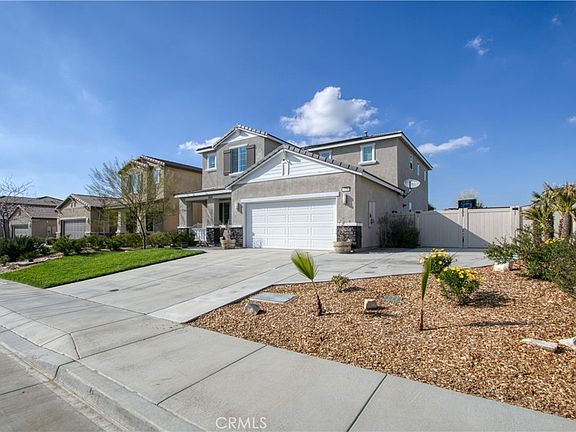 Welcome to your home in the highly sought-after community of Summerwind Trails! This well-maintained 5-bedroom, 3-bathroom residence is a true gem that combines elegance, functionality, and convenience. As you enter, notice the white shutters adorning the windows, setting the tone for the charm that awaits. The heart of this home lies in its oversized kitchen island, featuring stunning quartz countertops that create a focal point that seamlessly connects the kitchen to the family room, perfect for entertaining guests or spending quality time with loved ones. The upgraded mudroom provides a convenient space to drop items when coming in from the garage. With white cabinets and an extra-large walk-in pantry, the kitchen is not only stylish but also highly practical. The convenience of one bedroom downstairs adds flexibility, perfect for guests or a home office. Upstairs, the spacious primary bedroom treats you to breathtaking mountain views, providing a serene and tranquil retreat. A large loft area adds additional living space, suitable for a game room or lounge, and an upstairs laundry room simplifies daily chores. The extra-long garage with access to additional storage above ensures ample space. Step outside and discover the true allure of this property. Situated on a premium-sized lot, the backyard is a haven of possibilities. With a Large patio cover, playground, high-end above ground pool, generously left by the sellers for your enjoyment, and space for your RV along with a 220 hookup. This home is equipped with many smart home features, enhancing your lifestyle with modern convenience and energy efficiency. The property is not just a visual delight but also a functional one. A tankless water heater maintained every year ensures efficiency and reliability, while the fully paid-off solar panels allow you to take advantage of sustainable energy. Located in a newer neighborhood, this home is close to schools, freeways, and existing shopping options, with the added bonus of a highly anticipated premium shopping center, Oak Valley Town Center, currently under construction nearby. Don’t miss the opportunity to make this Summerwind Trails gem your forever home!