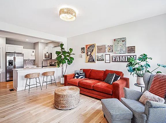 Townhome located in the sought-after Mill Ridge development! Large front porch welcomes you into this 3-bedroom, 3-bathroom home with tons of natural light and an open floor plan that seamlessly integrates the kitchen, living, and dining area. Kitchen features white cabinets, stainless steel appliances, quartz countertops, pantry and tile backsplash. Convenient 1/2 bath also on the mail level. Upstairs, the expansive primary bedroom is impressed with a tray ceiling, ensuite bath with dual vanity, shower, tiled shower with door and a lg walk-in closet. Down the hall are two additional spacious bedrooms, a full bathroom, and laundry room with storage shelves and a linen closet. Basement is plumbed for a future bath. Enjoy a carefree lifestyle in this community, which offers a clubhouse, pool, pickleball court, lawn care, snow removal, and exterior maintenance. Located just minutes from all the amenities Jordan Creek has to offer.