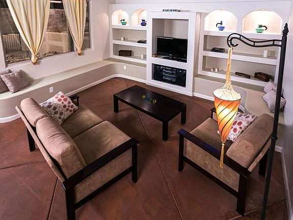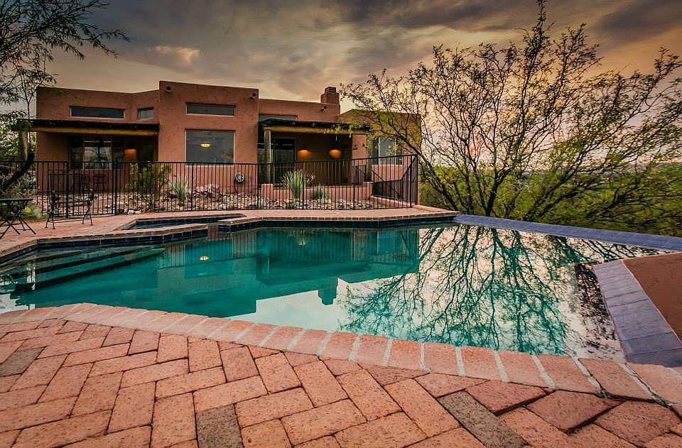 Fantastic setting for relaxing by the beautiful salt water negative edge pool! 3 Bedrooms plus office, bonus/storage room and 2.5 car garage. Upgrades include granite counter tops, stainless appliances, newer stove with convection oven, instant hot water at sink, cement floors, gas fireplace, media center, and solar panels. Back patio very private.