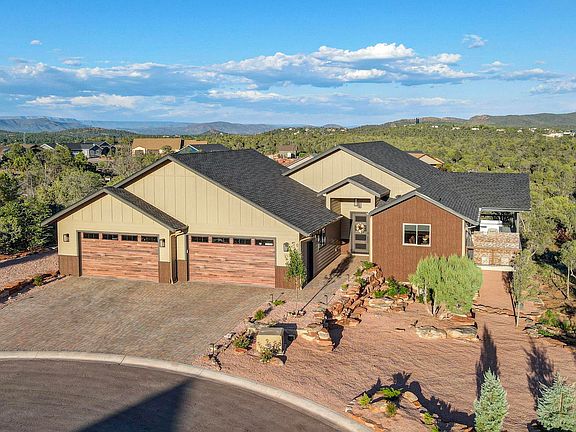 Constructed in 2024, this contemporary single-level, mountain-style residence features three bedrooms, two bathrooms, and a four-car garage, and is fully move-in ready. The property is professionally landscaped and irrigated, ensuring all exterior details are complete. Expansive wrap-around covered deck offers 270-degree panoramic mountain views, including The Rim, Stewart Ridge, Gibson Peak, Greenback Mountains, and the Mazatzal Range. Encompassing 2,031 square feet, the home sits atop two elevated lots (0.63 acres total) in the newer subdivision of Green Valley Vista with No HOA, conveniently located just minutes from Green Valley Park and Payson's amenities.